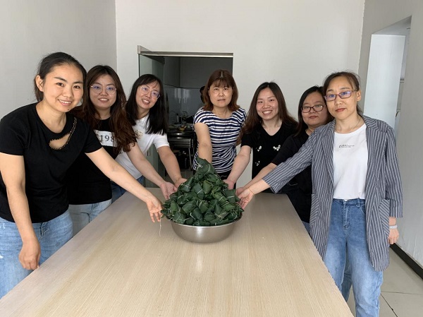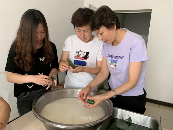 上午9点,粽叶、糯米、大枣整齐地摆上桌。大家边包边聊,其乐融融。在包粽子现场,熟悉包粽子的能手们飞快地拿起粽叶,两手一窝卷成漏斗状,填米、加枣、压紧、扎绳,一气呵成。她们还充当起“老师”的角色,教“新手”职工包粽子,手把手现场教学,“老师”教得仔细,“学生”学得认真,但要做出馅料十足、外观漂亮的粽子还是需要费一番功夫的。随着技巧的不断娴熟,一个多小时的时间,形状各异、大小不一的一百多个粽子就堆积成山了,预算科副科长窦梦娜说:“我们包粽子的水平真是越来越高了,明年再包会更好!”此时每个人心里都洋溢着一股喜悦之情,有初学一门手艺的欣喜,有参与集体活动交流感情的满足。