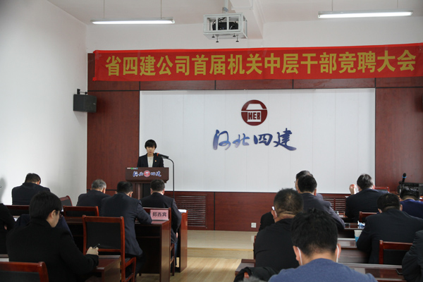 公开竞聘选贤才,四建才俊展风采。2021年2月24日,省四建公司首届机关中层正职岗位竞聘会在四楼培训中心举行。30人(次)英才跨上讲台,畅谈自己对11个中层正职岗位的履职目标和创新举措,为公司各部门的管理献计献策。这是公司成立以来首次机制改革大规模人才选拔考评活动。公司党委书记董事长董富强发表开赛致辞和总结讲话。公司党委副书记、纪委书记、工会主席李怀生主持竞聘大会。